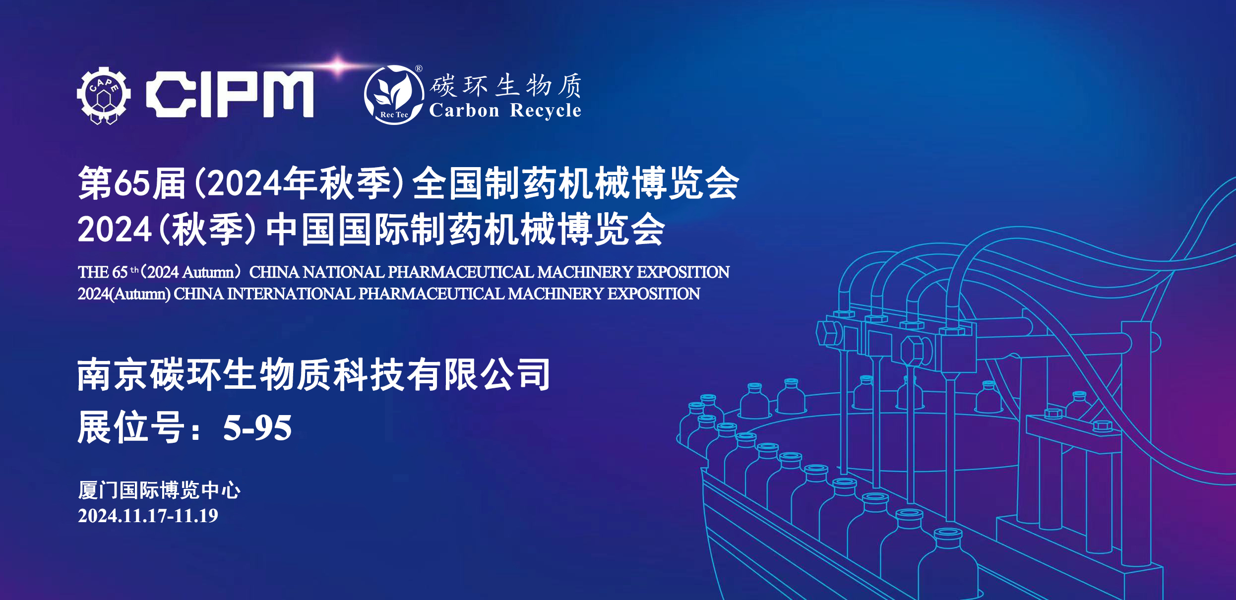南京碳環(huán)生物質(zhì)科技有限公司將于2024年11月17日-19日在廈門國(guó)際博覽中心參加第65屆 (2024年秋季) 全國(guó)制藥機(jī)械博覽會(huì)2024 (秋季) 中國(guó)國(guó)際制藥機(jī)械博覽會(huì)(以下簡(jiǎn)稱“藥機(jī)博覽會(huì)”),誠(chéng)摯邀請(qǐng)您蒞臨指導(dǎo)。